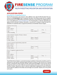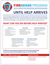 The Fire Sense Program was developed by Norfolk District Attorney Michael W. Morrissey to protect our youth, their families and communities from dangerous fire-related behavior. Fire Sense is a program to which courts, fire departments, police departments, schools, youth serving agencies and concerned family members can refer a juvenile for risk assessment, intervention and prevention education.